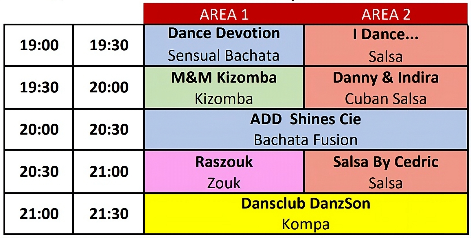 Celebrate Suriname’s vibrant dance scene with 30-minute workshops hosted by local dance schools in two simultaneous areas, covering Salsa, Bachata, Kizomba, and Zouk. Afterward, each school presents a show or demo, followed by the grand introduction of all international performers and teachers. The night ends with a rooftop party featuring two music zones: inside with Salsa & Bachata by DJs Willy and Jarzino (Netherlands), and outside with Soca, Dancehall, Kompa, Kizomba, Merengue, and Zouk by DJ Joel (Suriname) and DJ Fluffman (Trinidad). Dress Code: Casual.
